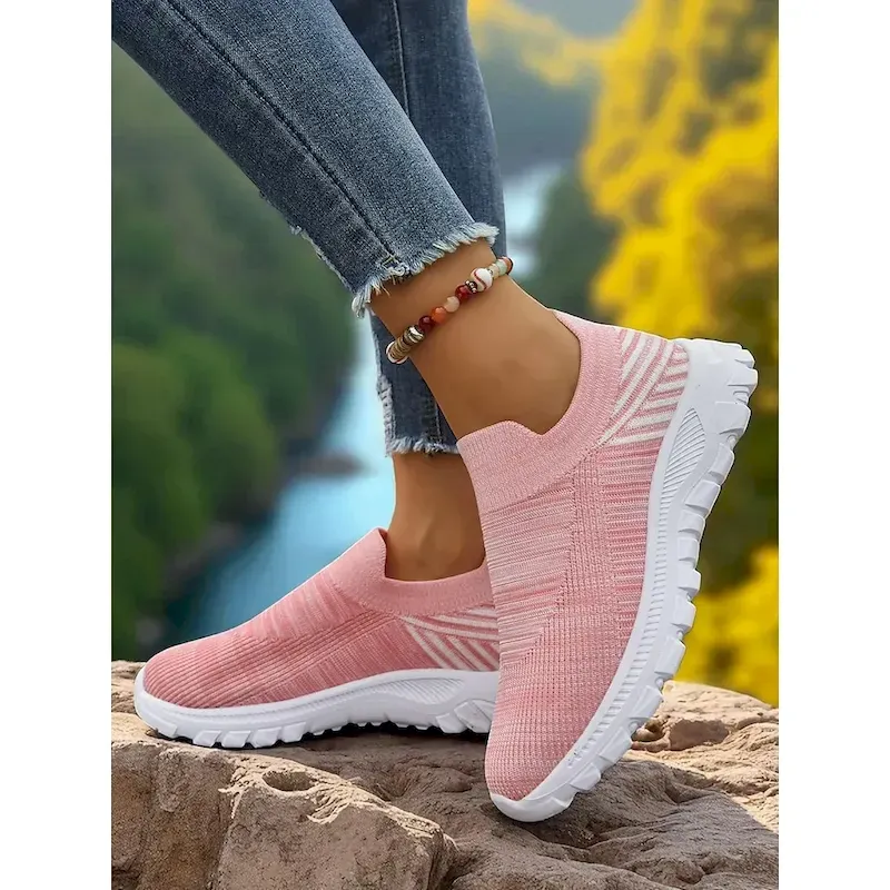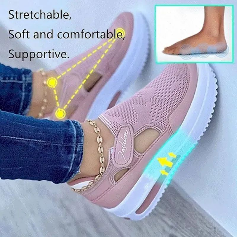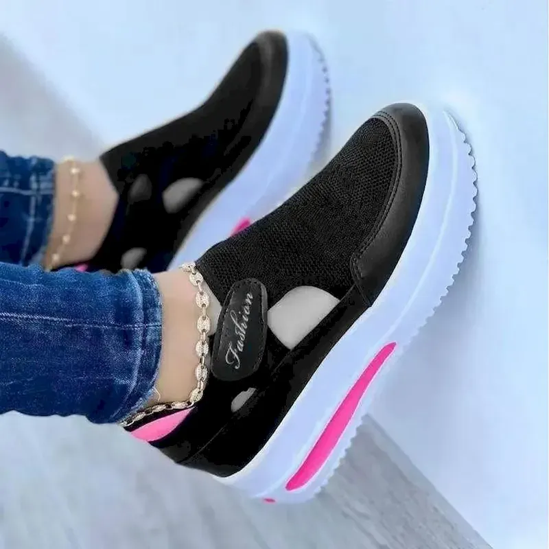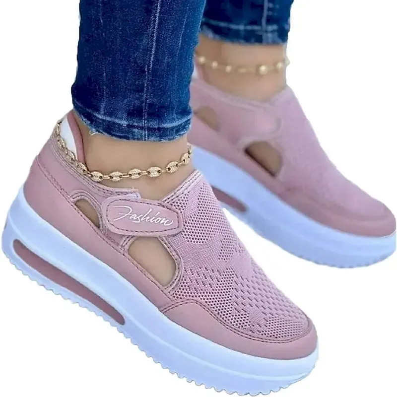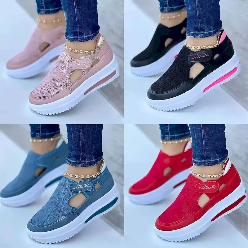 [Fabric]: Crafted with a breathable polyester and synthetic mesh upper, these Women’s Sneakers offer exceptional ventilation, ideal for warmer seasons like spring, summer, and fall. The durable construction ensures long-lasting wear without compromising on comfort.[Fit]: Designed with a platform wedge heel measuring between 2 to 3 inches, these slip-on sneakers provide a comfortable and supportive fit for all-day walking activities. The lightweight nature of the shoe allows for ease of movement, perfect for those who are constantly on their feet.[Design Highlights]: The sneakers feature a convenient Velcro strap closure, enhancing the ease of putting them on and taking them off, while also ensuring a secure fit. The thick rubber outsole delivers excellent traction across various surfaces. Their open design and round toe shape blend sporty and casual styles effortlessly, accented by solid color options of black, red, blue, and pink.[Occasions]: Perfect for everyday activities such as casual walks and daily wear. Whether you’re running errands or enjoying a leisurely stroll, these sneakers are your go-to choice for adding style and comfort. They’re also suitable for special occasions like Valentine’s Day, where their stylish look can complement your outfit.[Size Range]: Available in a versatile size range from US5.5 to US10, these sneakers cater to a wide variety of foot sizes. Perfect for fashion-conscious individuals looking for trendy footwear with the added benefit of comfort.OK