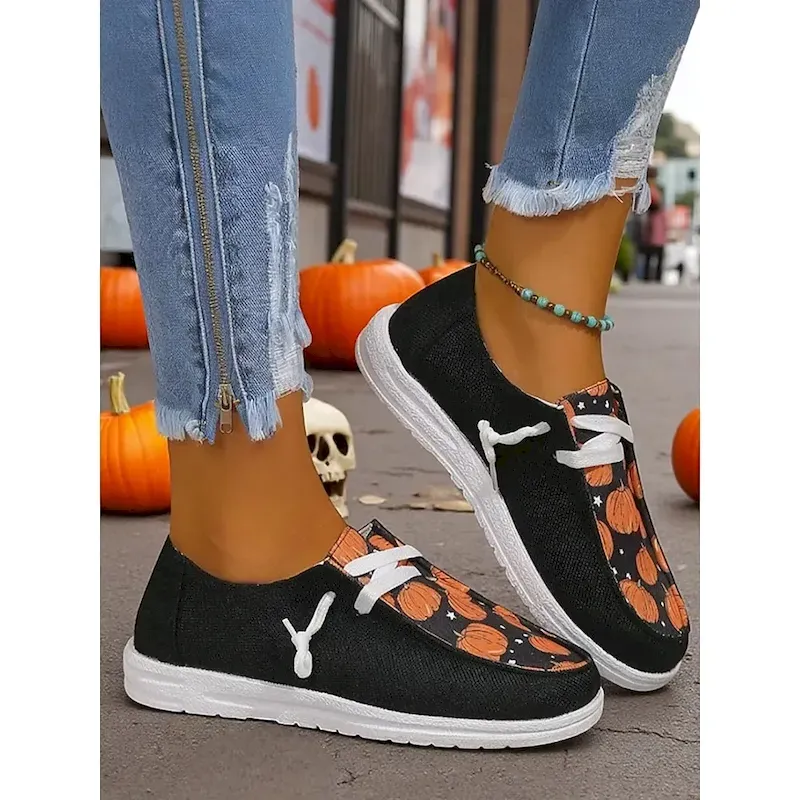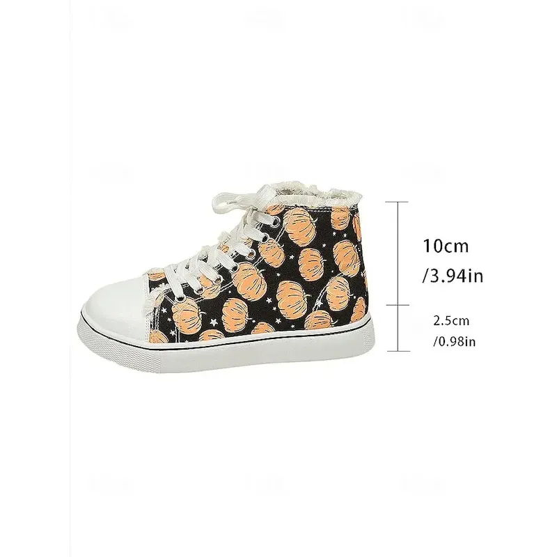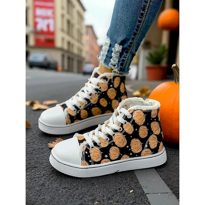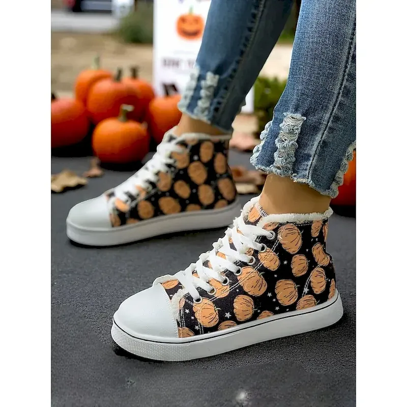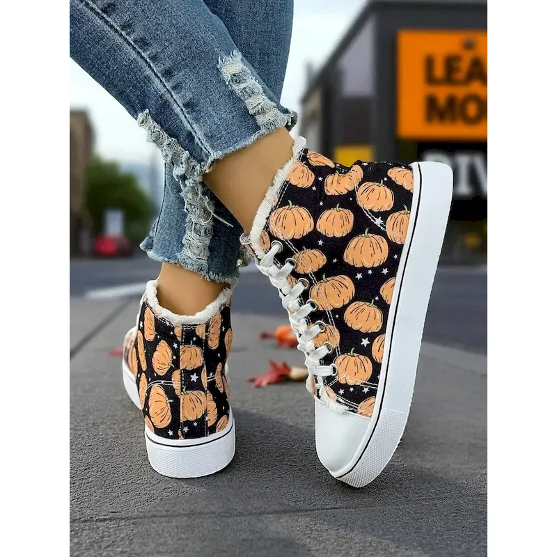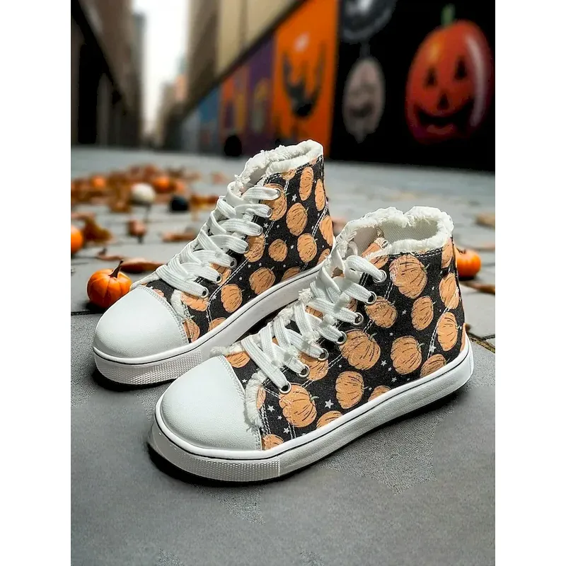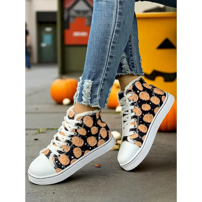 Women’s Halloween Pumpkin High Top Sneakers – Casual Canvas Lace-Up Shoes with Festive Print for Autumn, Costume Party and Everyday Wear