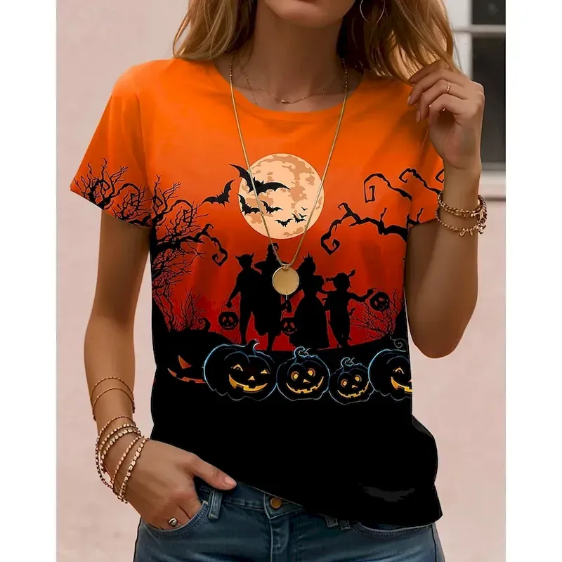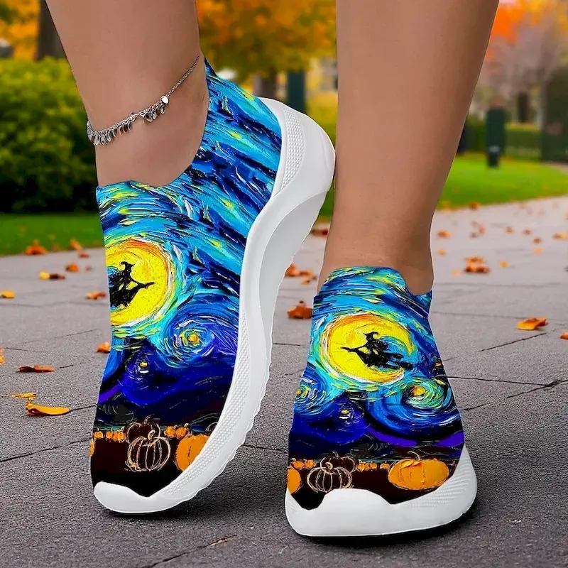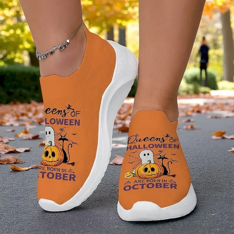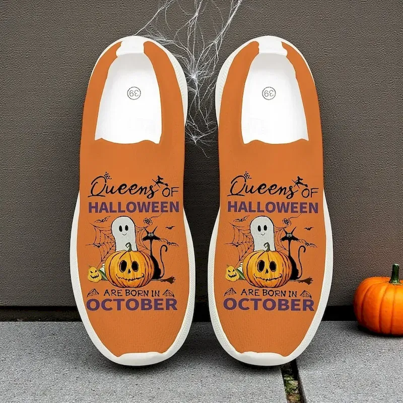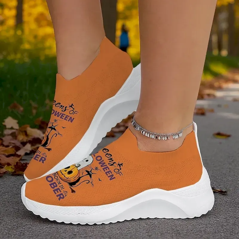 Women’s Orange Lightweight Walking Sneakers with Ghost and Pumpkin Print – Casual Shoes for Halloween Theme and Daily Wear