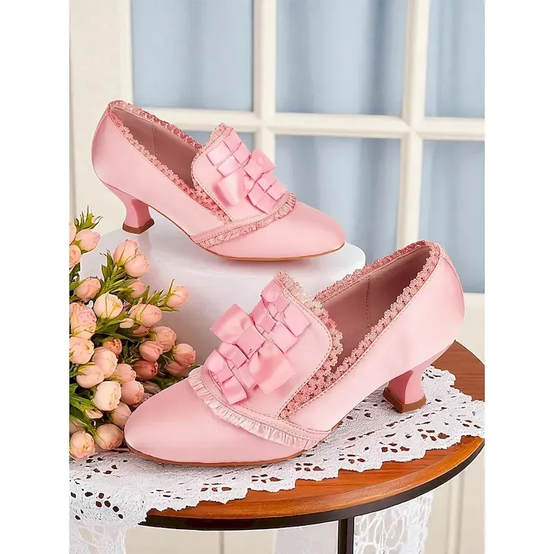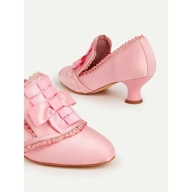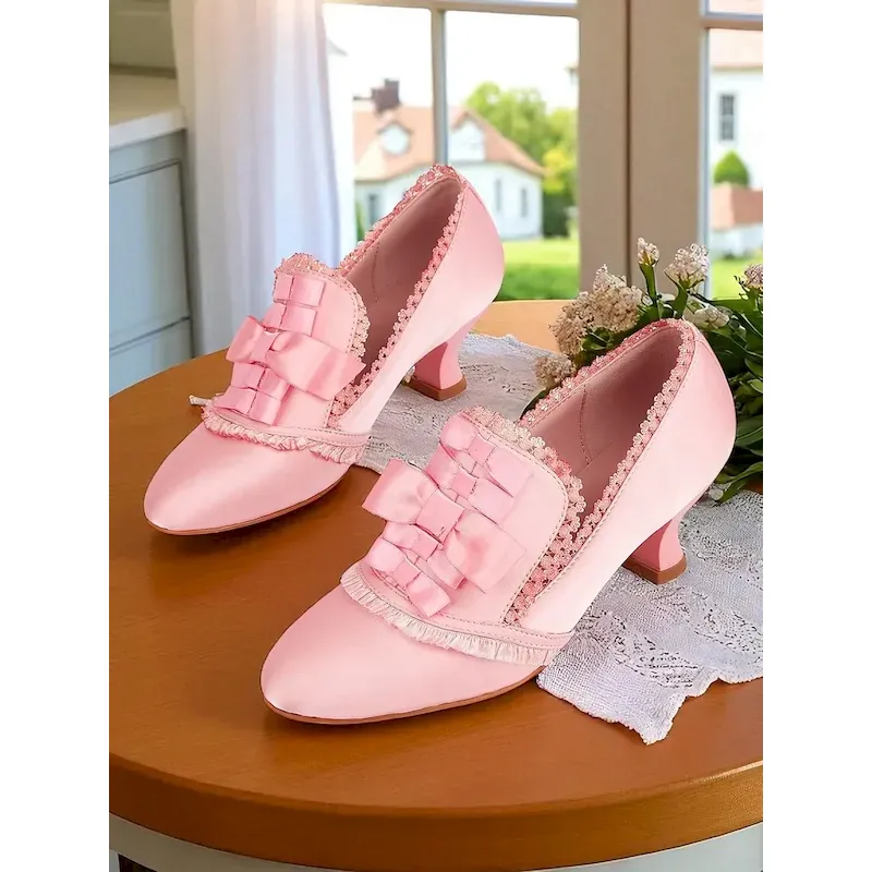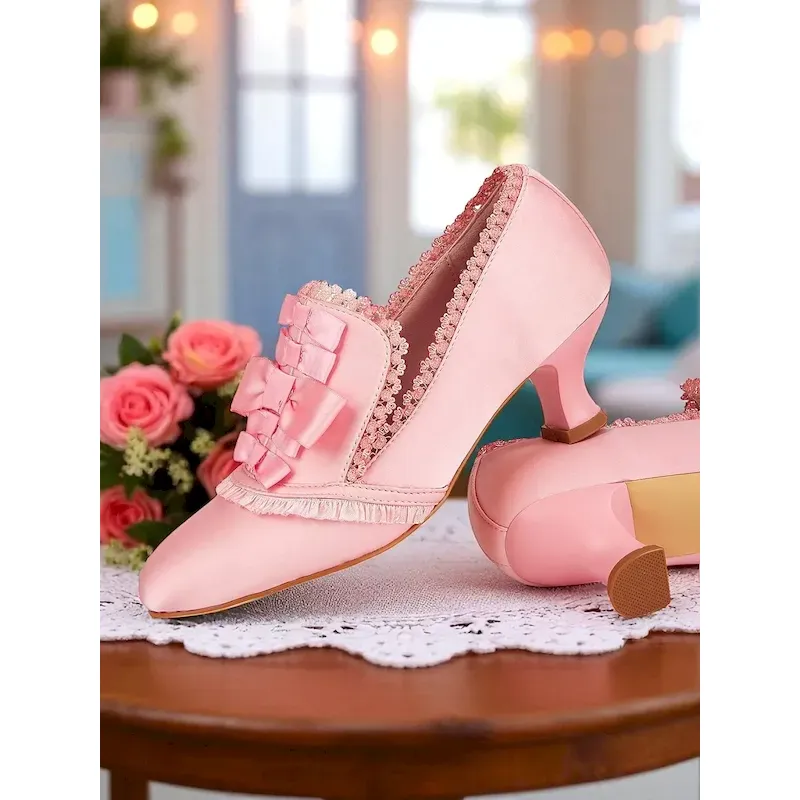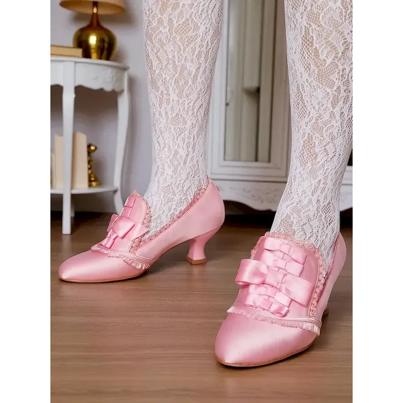 Women’s Pink Satin Bow Heels with Kitten Heel – 18th Rococo Victorian Court Style Dress Shoes for Cosplay, Tea Party and Historical Reenactments