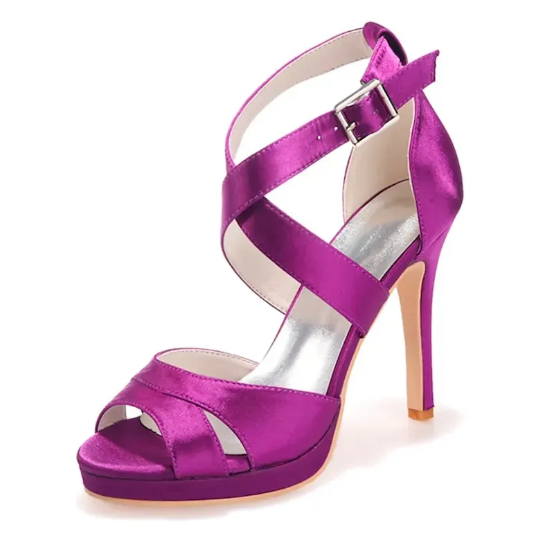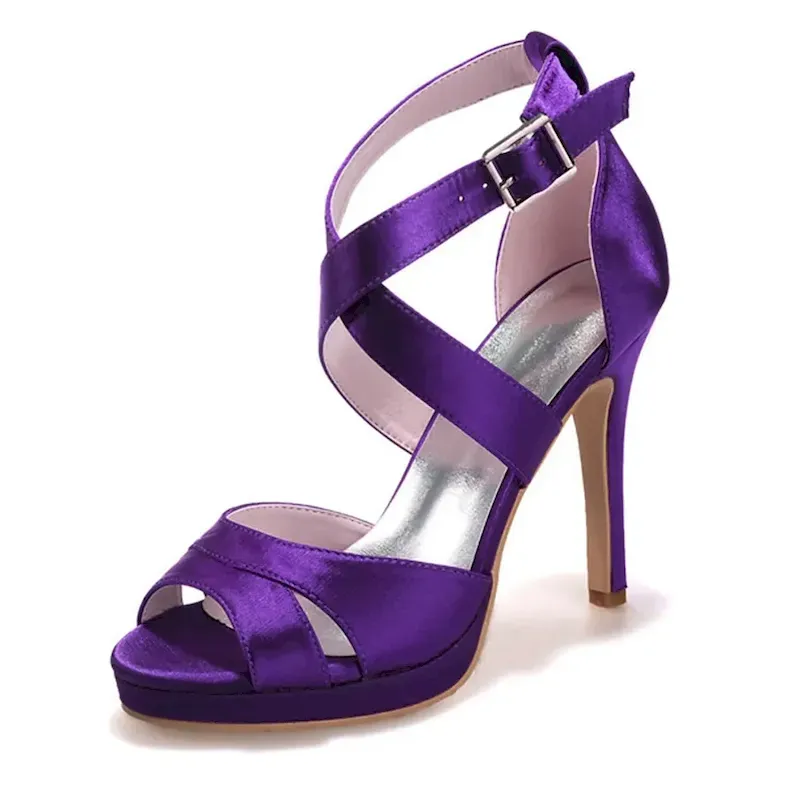Women’s Purple Satin Strappy High Heels – Platform Cocktail Sandals with Buckle Closure for Evening Parties and Weddings