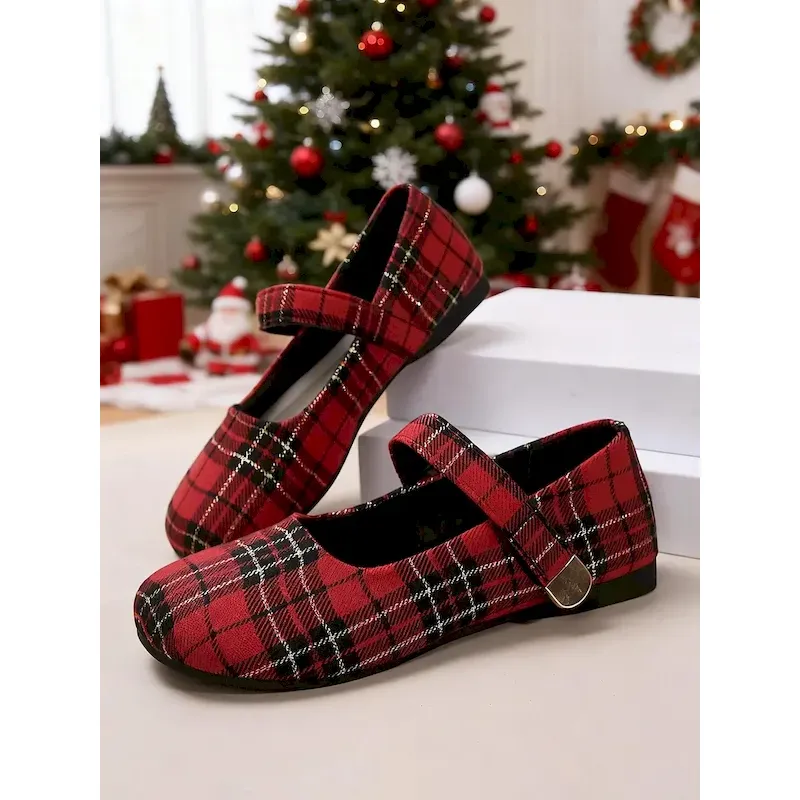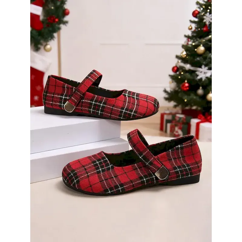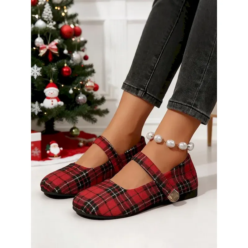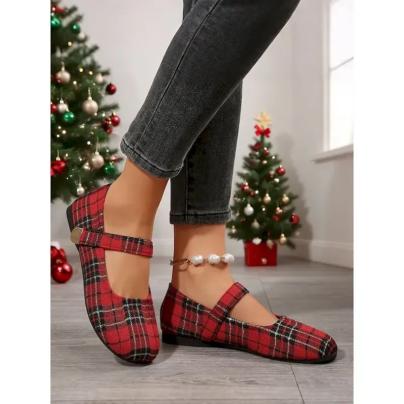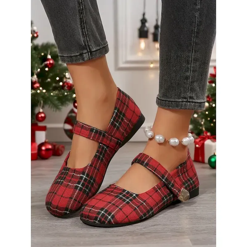 Women’s Red Plaid Mary Jane Flats with Adjustable Strap, Retro Comfortable Shoes for Christmas, Casual Outfits & Daily Wear