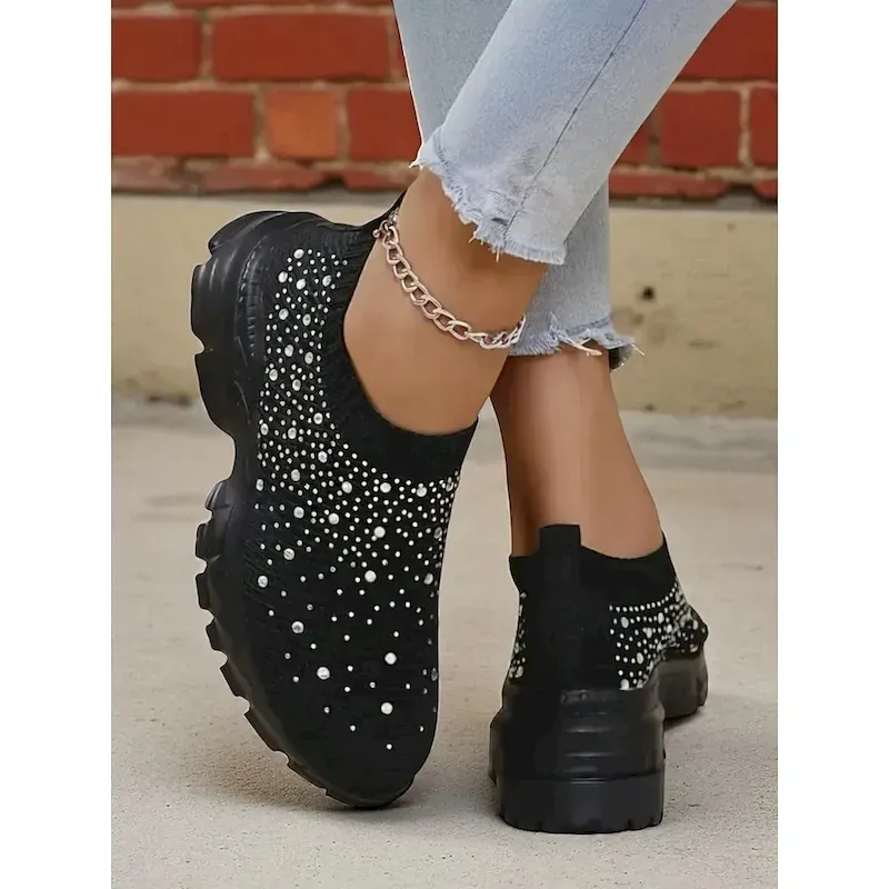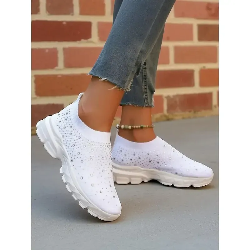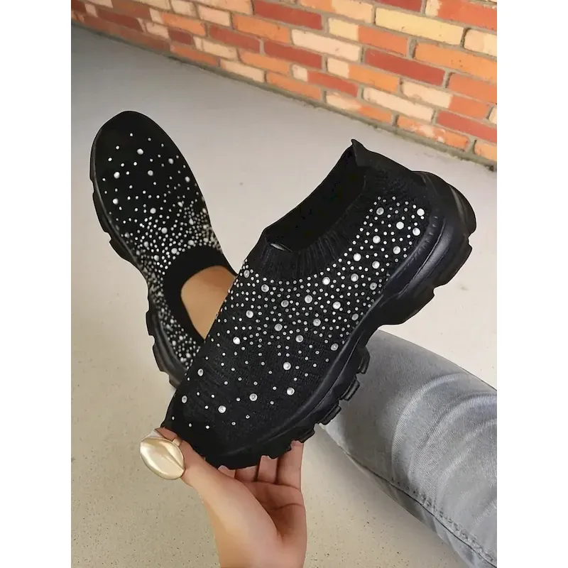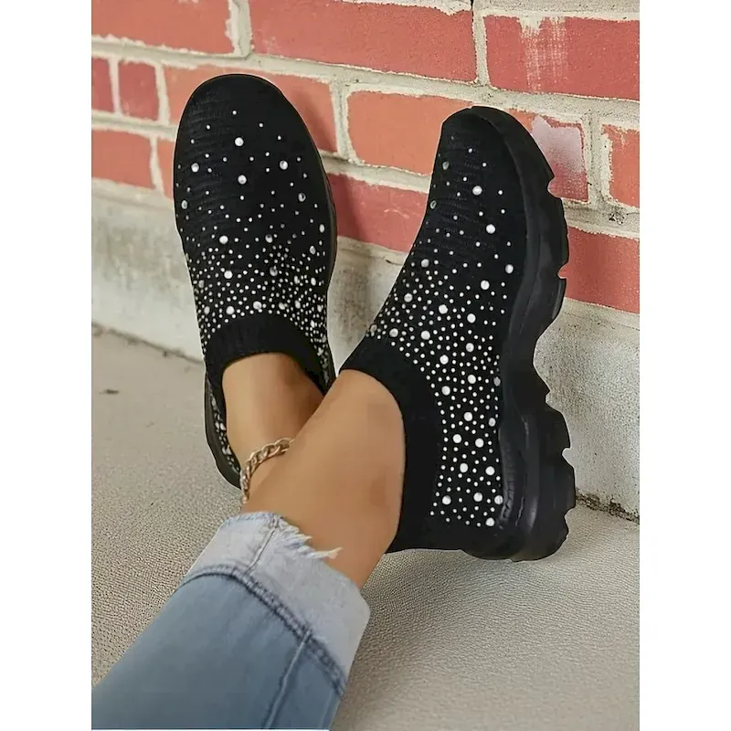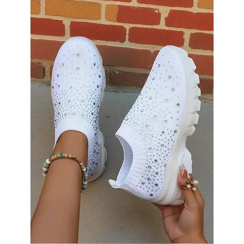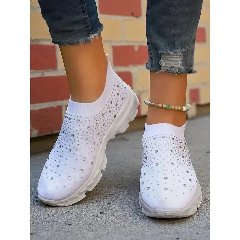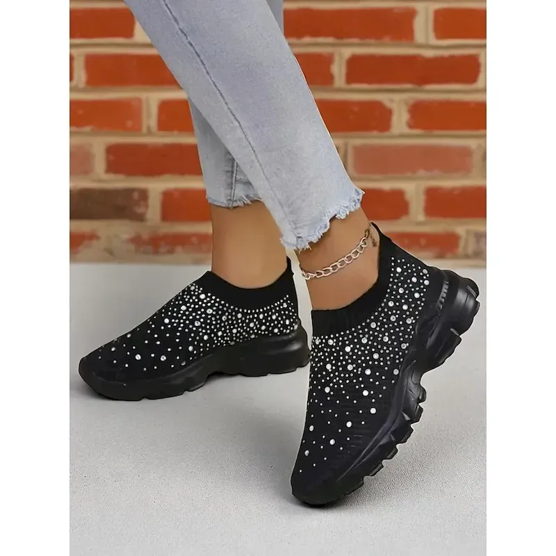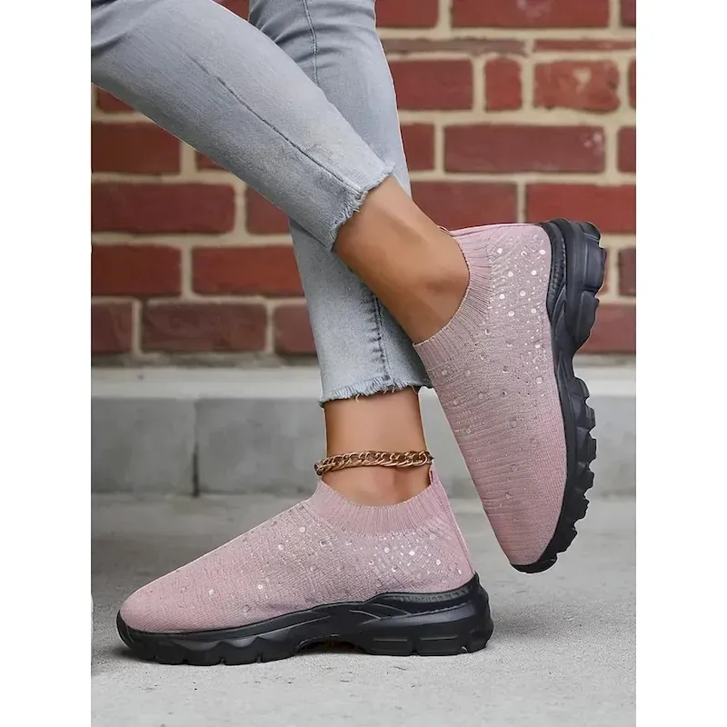 Women’s Sneakers Flyknit Shoes Christmas Daily Rhinestone Flat Heel Round Toe Casual Comfort Walking City Running Tissage Volant Loafer Black White Pink